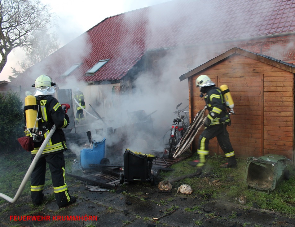Die Krummhörner Feuerwehr hat am Ostersonntag einen Wohngebäudebrand verhindert. In den frühen Morgenstunden des Ostersonntags wurden die Feuerwehren Krummhörn-Ost, Krummhörn-Nord und die Einsatzleitwagen-Gruppe um 05:55 Uhr zu einem Schuppenbrand nach Jennelt in die Uttumer Straße alarmiert. Bereits auf der Anfahrt zur Einsatzstelle war eine massive Rauchentwicklung zu erkennen. Zudem kam über die Leitstelle Ostfriesland die Meldung, dass sich das Feuer bereits auf das angrenzende Wohngebäude ausbreitet. Vor Ort brannte ein Schuppen bereits in voller Ausdehnung. Mehrere Trupps unter Atemschutz wurden umgehend zur Brandbekämpfung von mehreren Seiten eingesetzt. Durch das schnelle Eingreifen der Einsatzkräfte konnte die Ausbreitung des Brandes auf das angrenzende Wohngebäude verhindert werden. Die Feuerwehrleute mussten einen kleinen Teil der Dachpfannen abnehmen, um auch letzte Glutnester ablöschen zu können. Mit der Wärmebildkamera wurde der Innenbereich des gesamten Gebäudes überprüft. Hier konnten keine bedenklichen Werte festgestellt werden. Nach rund zwei Stunden konnten die 45 Einsatzkräfte der Krummhörner Feuerwehren die Einsatzstelle verlassen. Ebenfalls im Einsatz war die Polizei, der zuständige Energieversorger und der Bauhof der Gemeinde Krummhörn.