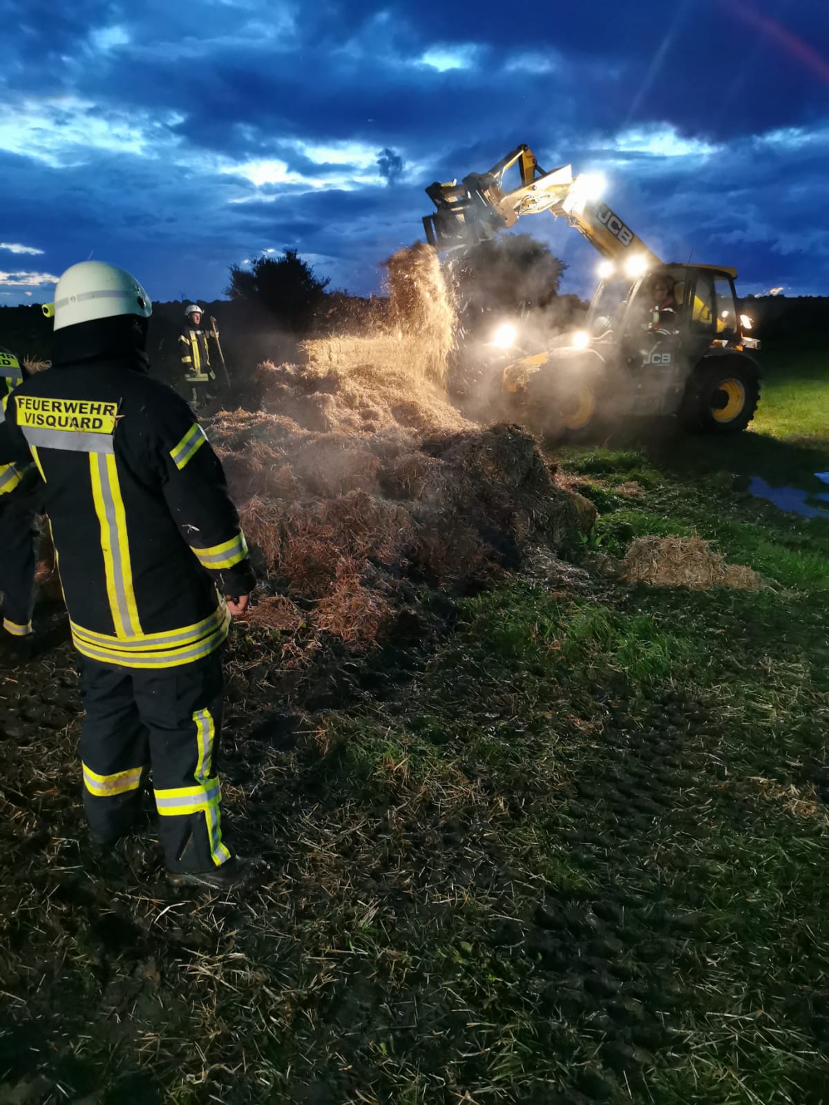 Die Ortsfeuerwehr Visquard blieb noch vor Ort und zog einige der Ballen auseinander. Auf Grund der hohen Innentemperatur von 80 Grad Celsius dampften diese bereits. Der Feuerwehreinsatz zog sich bis in die späten Abendstunden hin. Im Einsatz waren 50 Einsatzkräfte der Krummhörner Feuerwehr.