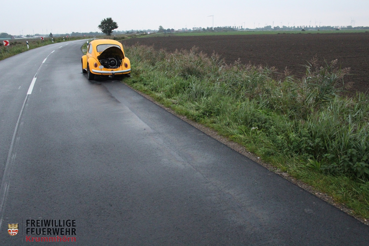 Ein Defekt am Motor eines Fahrzeugs hat am Sonntagabend für einen Feuerwehreinsatz auf der Landesstraße zwischen Rysum und Wybelsum gesorgt. Dem Fahrer des Volkswagen Käfers war auf der Landesstraße in Fahrtrichtung Wybelsum aufgefallen, dass aus seinem Fahrzeug Öl austrat. Er stoppte sein Fahrzeug auf der Landesstraße. Um 18:36 ist seitens der Regionalleitstelle Ostfriesland die Ölschadensgruppe der Feuerwehr Krummhörn-Nord alarmiert worden. Die Einsatzkräfte der Feuerwehr sicherten die Einsatzstelle ab und legten unter dem Fahrzeug ein spezielles Ölbindevlies aus, um eine weitere Ausbreitung des Betriebsstoffes zu verhindern. Die Ölspur hatte eine Länge von rund 100 Metern. Ein Spezialunternehmen übernahm die fachgerechte Reinigung der Straße. Nach zwei Stunden konnten die Einsatzkräfte der Feuerwehr, die mit drei Fahrzeugen vor Ort waren, den Einsatz beenden. Neben der Feuerwehr und einem Spezialunternehmen war auch der zuständige Straßenbaulastträger vor Ort.