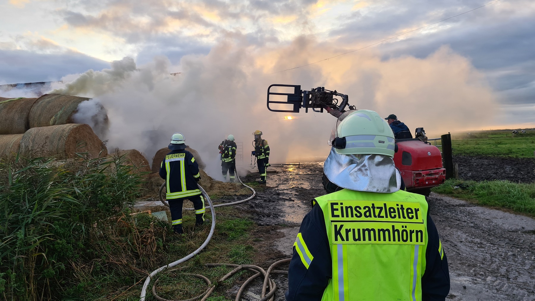 Etwa 35 Heuballen haben am Mittwochmorgen an der Langwehrstraße in der Krummhörner Ortschaft Freepsum gebrannt. Gegen 07:20 Uhr sind die Feuerwehren Pewsum-Woltzeten und Canum-Freepsum von der Kooperativen Regionalleitstelle Ostfriesland zu einem landwirtschaftlichen Betrieb in die Langwehrstraße alarmiert worden. Als die Einsatzkräfte der Feuerwehr Pewsum-Woltzeten vor Ort eintrafen, drang bereits dichter Qualm aus den Heuballen, die im Nahbereich einer Scheune gelagert waren. Die ausgerückten Einsatzkräfte leiteten daraufhin erste Löschmaßnahmen ein. Im weiteren Einsatzverlauf fuhr der Landwirt die Ballen auf ein angrenzendes Feld, wo diese dann auseinandergezogen und vollständig abgelöscht werden konnten. Nach mehreren Stunden waren auch die letzten Glutnester abgelöscht und die Feuerwehr konnte wieder abrücken. Neben der Feuerwehr war auch die Polizei vor Ort.