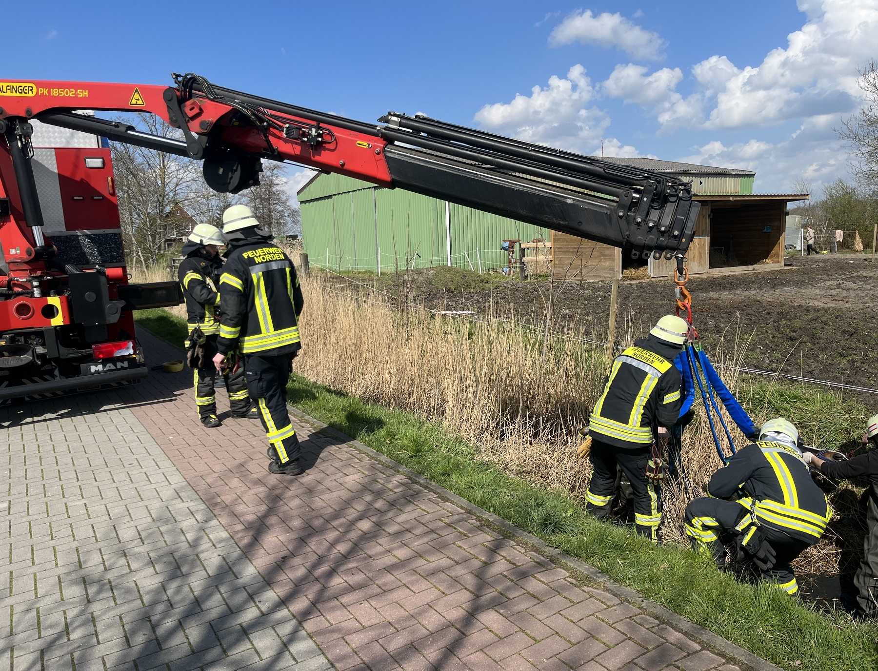 Ein 23 Jahre altes Pferd musste am Freitagmittag in der Gemeinde Krummhörn von der Feuerwehr aus einem Graben gerettet werden. Um 12:25 Uhr ist die Feuerwehr Krummhörn-Ost von der Kooperativen Regionalleitstelle Ostfriesland in den Bennlander Weg in Eilsum alarmiert worden, weil dort ein Pferd in einen mit Wasser gefüllten Graben geraten war und nicht mehr eigenständig herauskam. Um das erschöpfte Tier retten zu können, forderte die Feuerwehr Krummhörn-Ost den in Norden stationierten Rüstwagen-Kran des Landkreises Aurich an. Mit dem Kran des Rüstwagens gelang es, das Pferd ruhig und gelassen aus dem Graben zu heben. Die Besitzerin führte das Pferd anschließend erleichtert an einer Leine zurück auf den Hof. Im Einsatz waren die Feuerwehr Krummhörn-Ost und der Rüstwagen-Kran des Landkreises Aurich. |