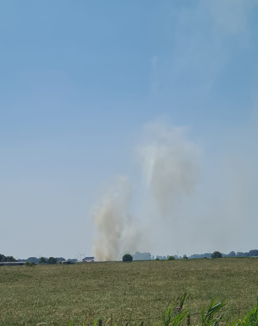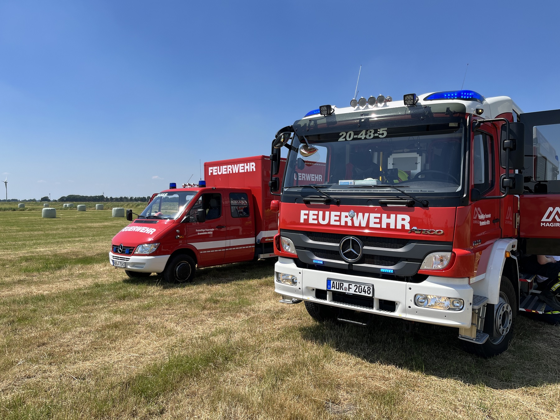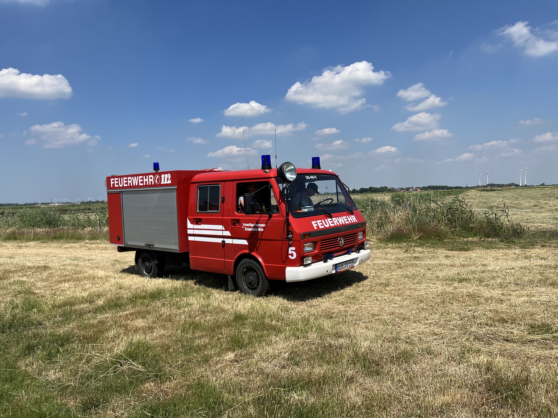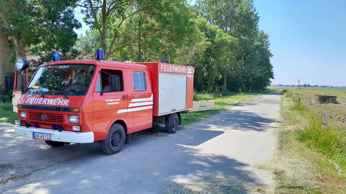 Auf einem Feld in Freepsum (Gemeinde Krummhörn) geriet am Sonntagmittag Heu auf einer Fläche von ca. 4.500 Quadratmetern in Brand. Die Landwirte bemerkten den Brand und alarmierten sofort die Feuerwehr Krummhörn-Mitte gegen 12:25 Uhr über den Notruf 112. Mit einem Traktor und angehängtem Güllefass leiteten die Landwirte sofort erste Maßnahmen ein, um eine weitere Ausbreitung des Brandes zu verhindern. Hand in Hand gelang es der Feuerwehr und den Landwirten das Feuer zügig unter Kontrolle zu bringen und damit weiteren Schaden abzuwenden. Letztendlich kamen bei diesem Einsatz zwei Güllefässer zum Einsatz, die maßgeblich zum schnellen Einsatzerfolg beigetragen haben. In der ersten Phase des Einsatzes ist die Alarmstufe erhöht worden, sodass die Feuerwehr Krummhörn-West zur Unterstützung hinzualarmiert worden ist. Die Feuerwehr Krummhörn-West verfügt über einen Schlauchwagen mit 1000-Meter Schlauchleitung, der bei Wasserversorgungen über lange Wegstrecken zum Einsatz kommt. Die Ortsfeuerwehr Krummhörn-West musste vor Ort jedoch nicht mehr tätig werden.