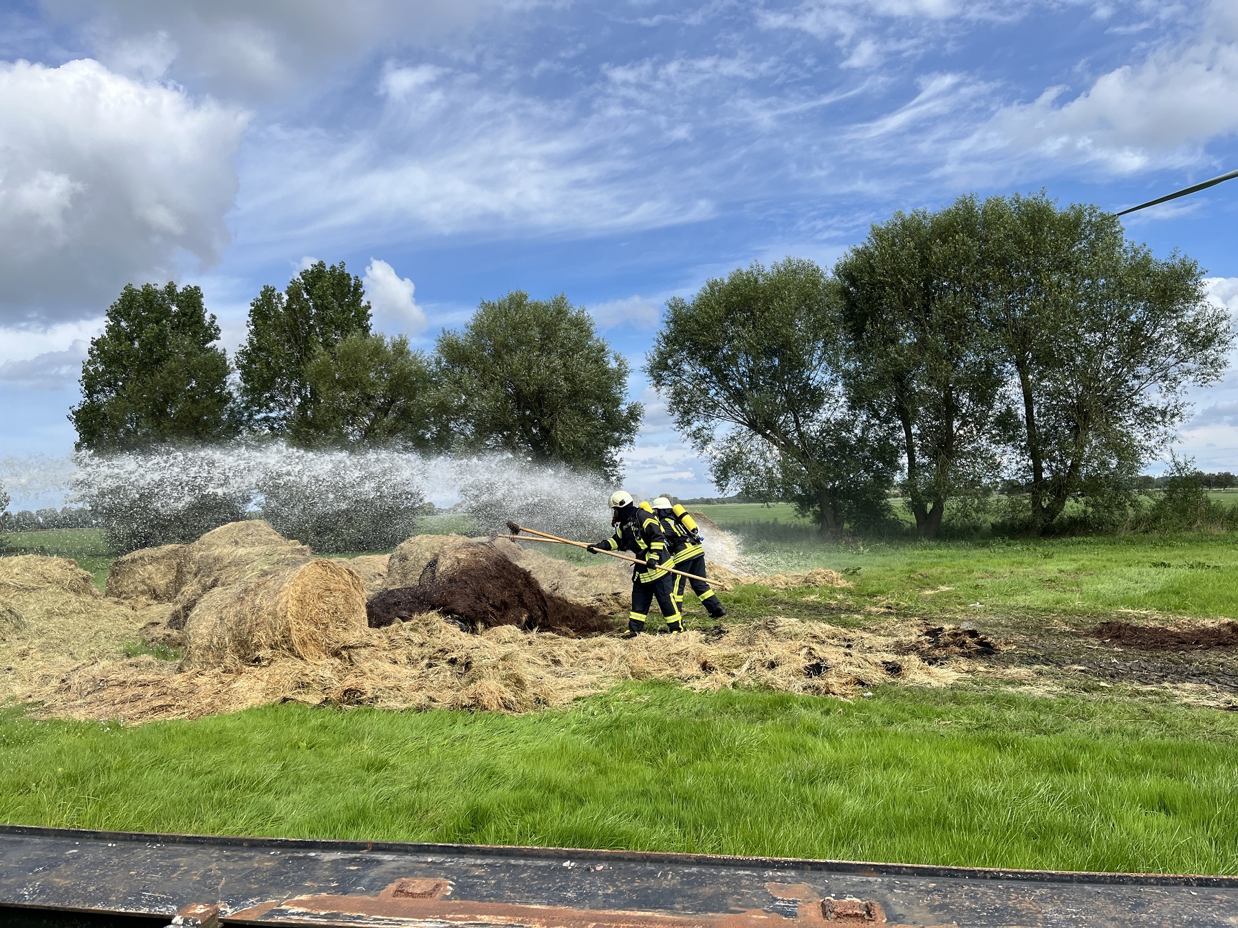 Am Samstagvormittag hat es im Groothuser Maarweg in einer landwirtschaftlich genutzten Halle gebrannt. Die Kooperative Regionalleitstelle Ostfriesland alarmierte daraufhin um 10:08 Uhr die Feuerwehren Krummhörn-West, Krummhörn-Mitte und Krummhörn-Süd zur Einsatzstelle. Als die ersten Einsatzkräfte vor Ort eintrafen, sind umgehend mehrere Trupps unter Atemschutz zur Brandbekämpfung eingesetzt worden. Das Löschwasser entnahmen die Einsatzkräfte aus einem Bohrbrunnen und dem Groothusener Tief. Insgesamt mussten einige hundert Meter Schlauchleitung verlegt werden. Ein in der Halle abgestelltes landwirtschaftlich genutztes Gerät musste vom Landwirt aus dieser entfernt werden. Im Anschluss sind alle Heuballen aus der landwirtschaftlich genutzten Halle gefahren, auf einer Grünfläche auseinandergezogen und gezielt abgelöscht worden. Die Halle ist durch den Brand sehr stark beschädigt worden. Personen wurden nicht verletzt. Zur Absicherung der Einsatzkräfte war zunächst ein Rettungswagen vom Rettungsdienst des Landkreises Aurich vor Ort. Nach dem Eintreffen des DRK Hinte übernahmen die Helfer des Deutschen Roten Kreuzes die Absicherung der Einsatzkräfte. Im Einsatz waren die Feuerwehren Krummhörn-West, Krummhörn-Mitte und Krummhörn-Süd, die Polizei, der zuständige Energieversorger, die Untere Wasserbehörde, der Rettungsdienst des Landkreises Aurich und das Deutsche Rote Kreuz aus Hinte.